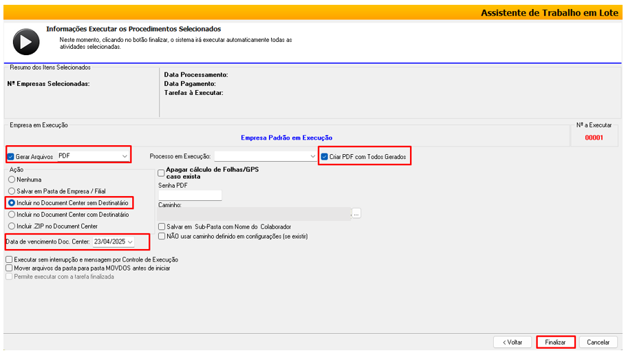 🔸 Os relatórios gerados serão automaticamente salvos na pasta configurada no cadastro do funcionário e, simultaneamente, enviados ao Documento Center para posterior disponibilização ao cliente.