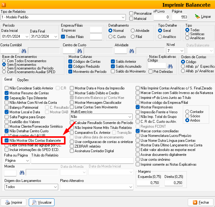 Marque a flag ‘Não Mostrar Obs. Contas Balancete’;