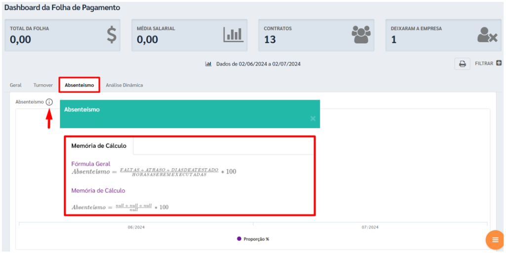 Clique no ícone (i) indicado abaixo para visualizar a memória de cálculo do absenteísmo.