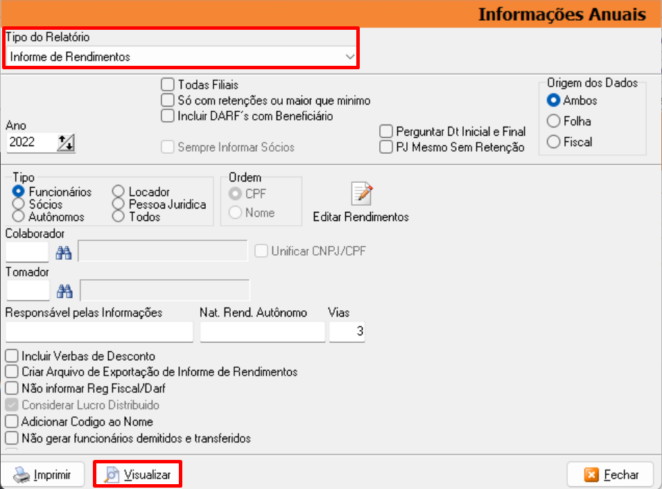 Selecione Tipo do Relatório ‘Informe de Rendimentos’ e marque as outras opções pertinentes ao relatório que deseja gerar;