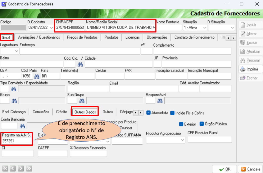Para definição do convênio na aba funcionários, deve se primeiro realizar o Cadastro da Operadora no Módulo Fiscal > Cadastros > Pessoas > Fornecedores > ‘Aba Outros Dados’.