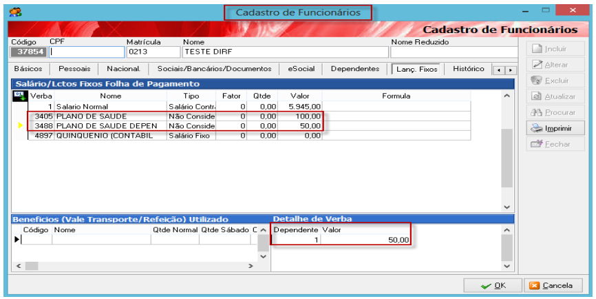 No Athenas essas informações serão levadas automaticamente se os dados dos dependentes do IR dentro do cadastro de funcionários estiverem devidamente preenchidos, conforme modelo abaixo, e se no momento do cálculo das folhas processadas durante o ano onde houve o desconto do plano, as verbas descontadas, referente ao plano saúde titular e plano saúde dependente estiverem devidamente digitadas na tela de lançamentos fixos localizada também no cadastro de funcionários.