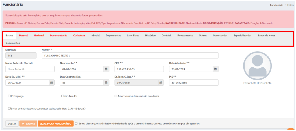 Após preenchimento de todos os campos obrigatórios, o sistema irá emitir a mensagem: ‘Todos os campos obrigatórios foram preenchidos. O cadastro foi salvo como funcionário’.