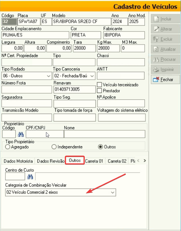 - No campo Categoria de Combinação Veicular, selecione a categoria correta.