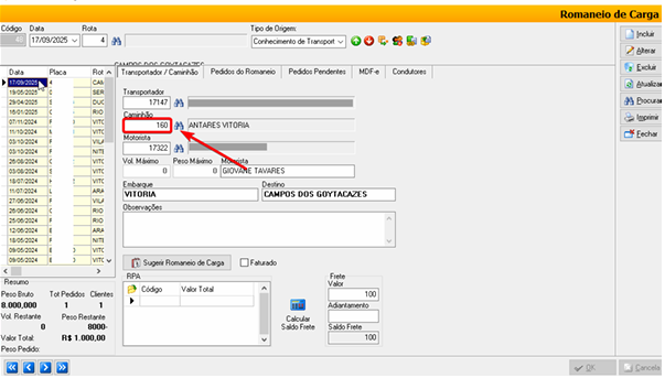 - Localize o Romaneio de Carga (MDF-e) que apresentou a rejeição.