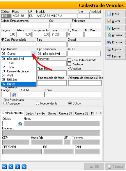 - Ajuste o campo Tipo de Rodado (tpRod) para um código válido, preferencialmente: