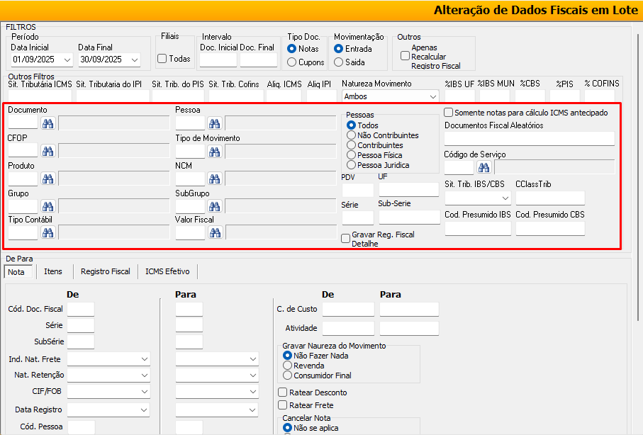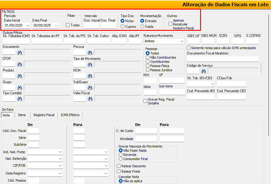 No quadrante Filtros, informe obrigatoriamente os parâmetros abaixo, que determinam quais documentos fiscais serão considerados na alteração em lote: