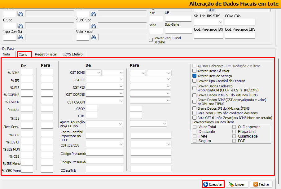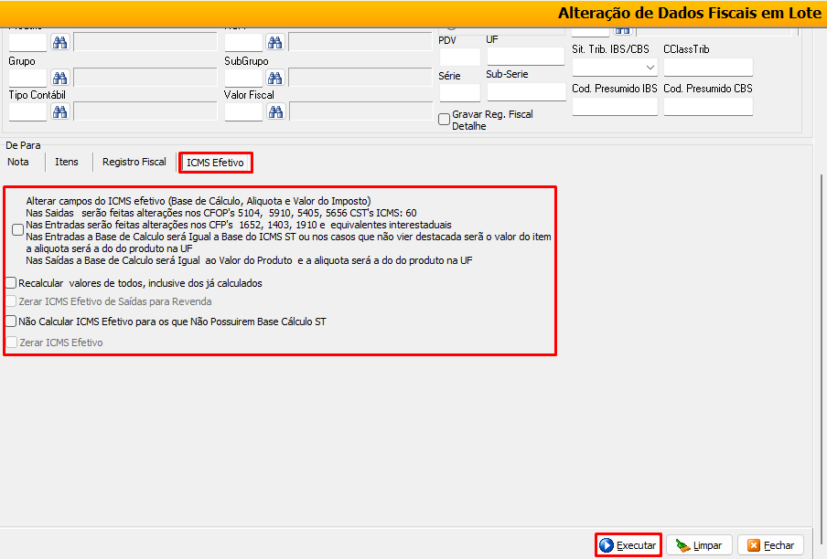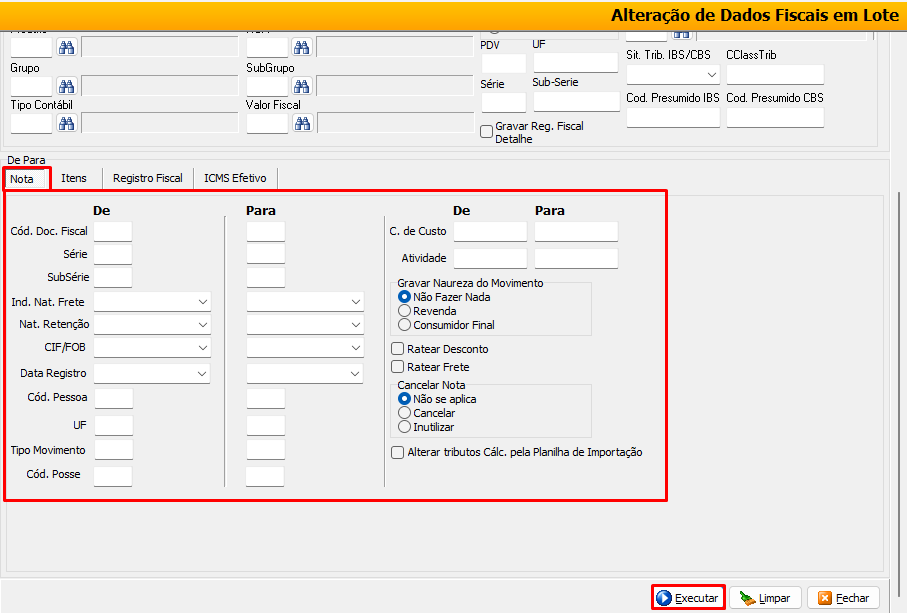 – Algumas opções da rotina Alterar Dados Fiscais em Lote são complementares a outras funcionalidades do sistema.