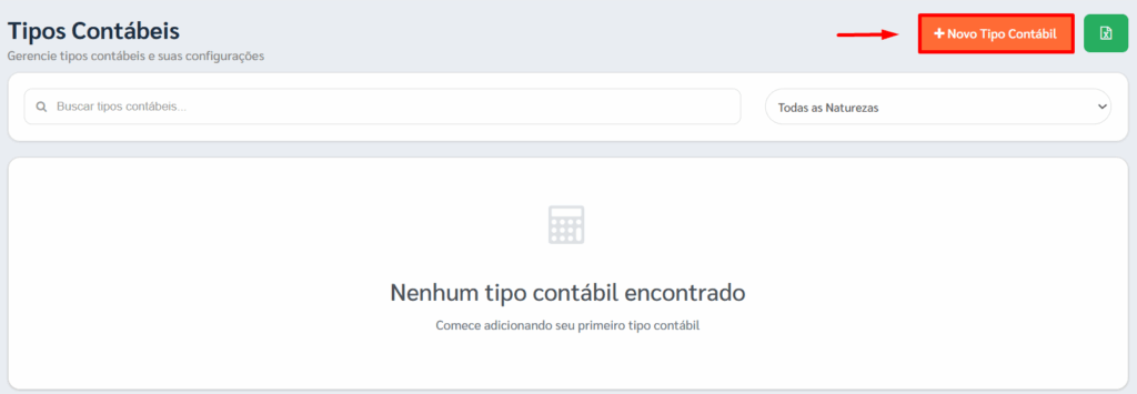 Clique no botão [+ Novo Tipo Contábil] para iniciar o cadastro.