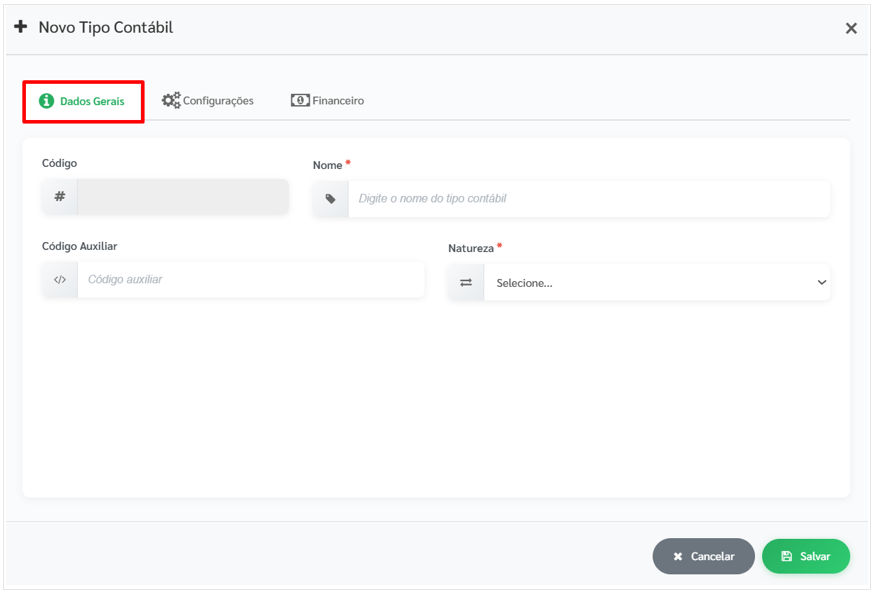 Natureza: selecione se o tipo contábil corresponde a Receita ou Despesa.