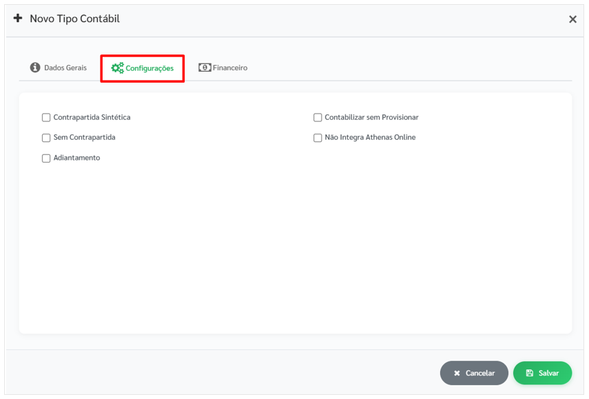 Não Integra Athenas Online: use quando este tipo contábil não deve ser integrado automaticamente com os módulos do Athenas Online.