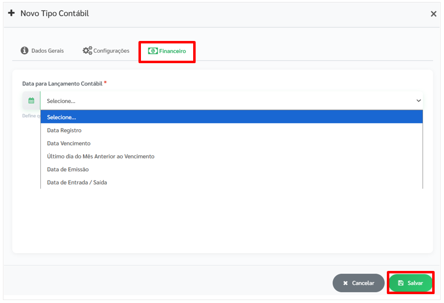 No campo Data para Lançamento Contábil, selecione qual data será utilizada como referência para os registros. As opções disponíveis são: