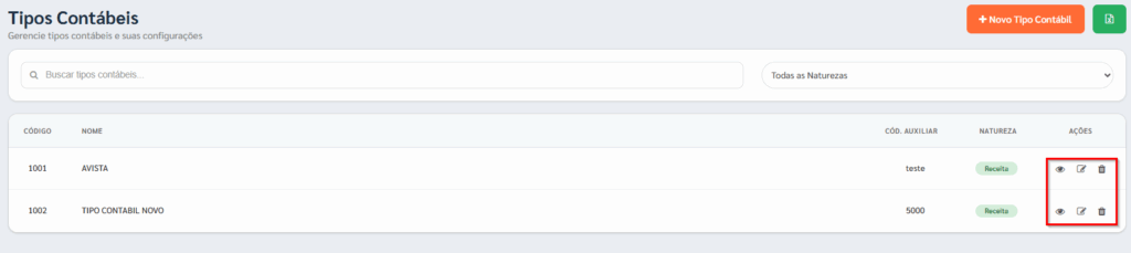 Na tela principal, após o cadastro, os tipos contábeis da empresa serão exibidos em lista.