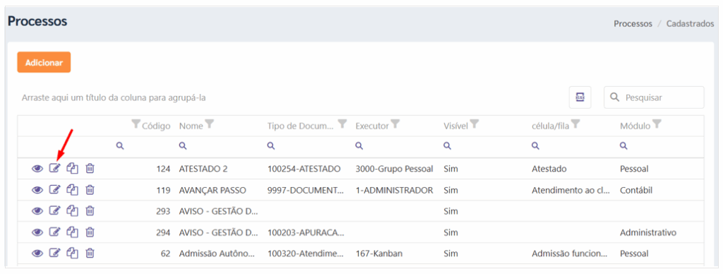 Localize o processo desejado na listagem e clique em [Controlar Processo] para abrir o modo de edição.