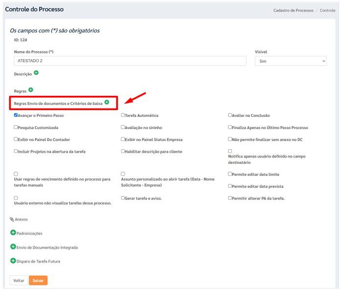 Com o processo aberto, acesse a aba “Regras de Envio de Documentos e Critérios de Baixa”.