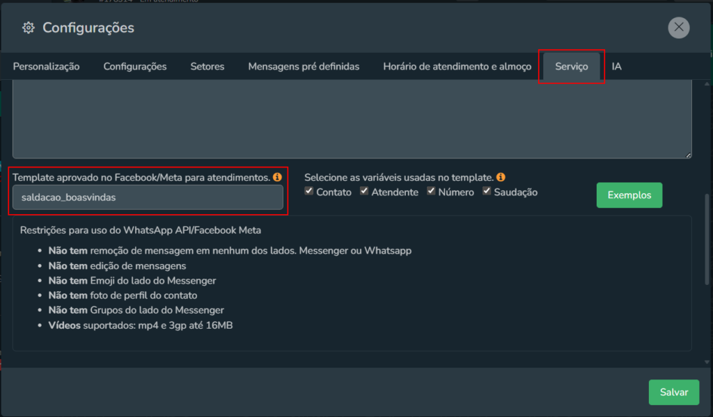 No campo Template aprovado no Facebook/Meta para atendimentos: