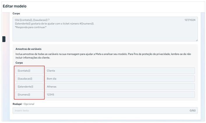 Exemplo – Modelo com variáveis {{contato}}, {{atendente}} e {{numero}}
