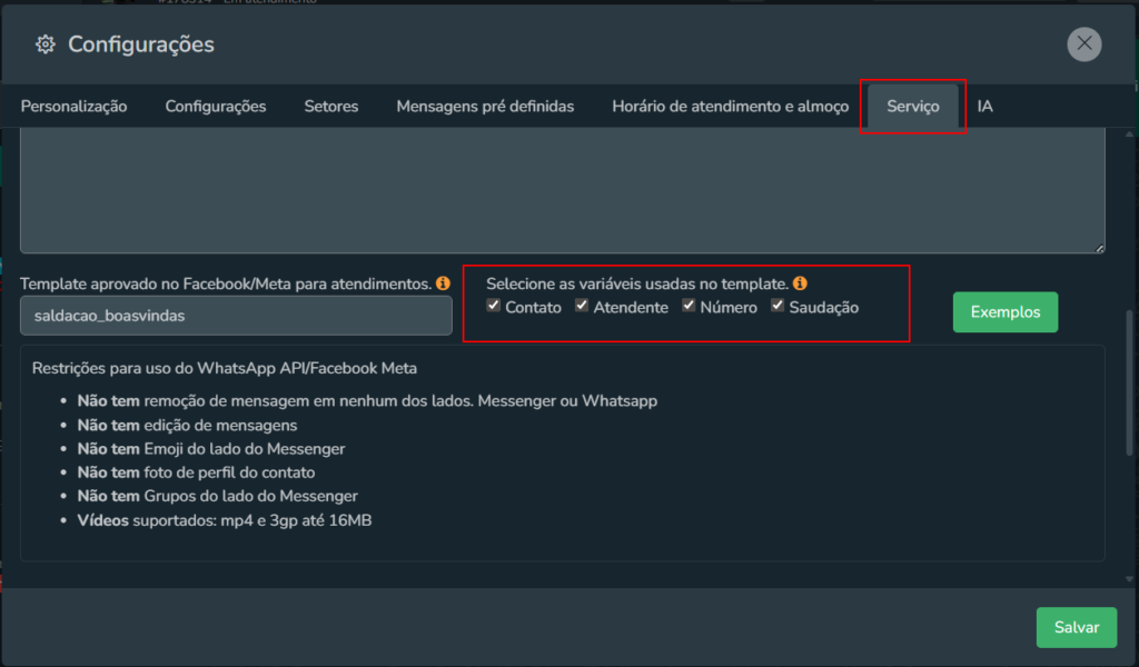 (ex.: {{contato}}, {{saudacao}}, {{atendente}}, {{numero}}).