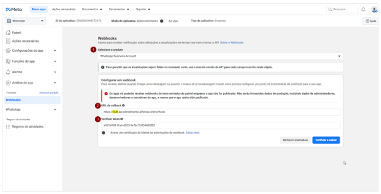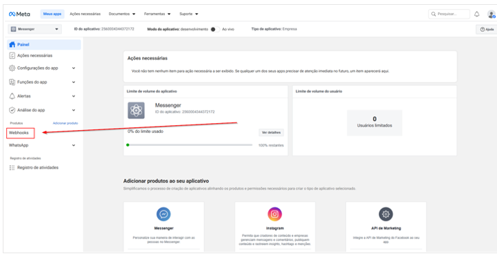 Nesta etapa, será realizada a configuração do Webhook do aplicativo na plataforma da Meta, permitindo a comunicação entre o WhatsApp Business e o Messenger.