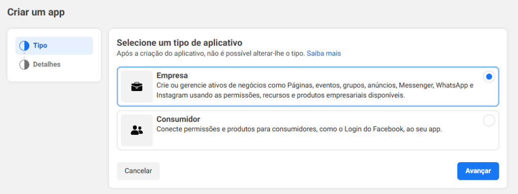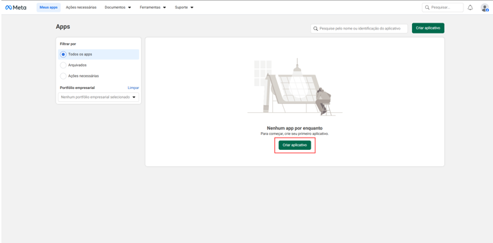 Para dar continuidade à configuração, é necessário criar um aplicativo na plataforma de desenvolvedores da Meta.