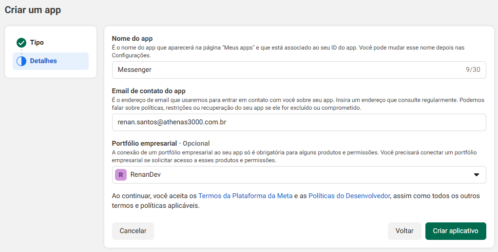 Esse aplicativo será a base técnica para ativar e gerenciar a API do WhatsApp Business. Use nomes claros e evite duplicidade com outros apps que já possam existir em sua conta de desenvolvedor.