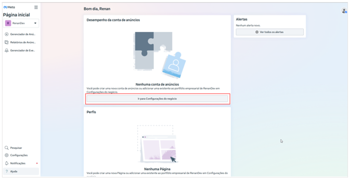 No painel de administração da conta comercial da Meta, acesse o menu: