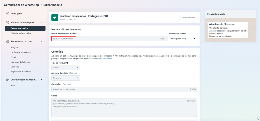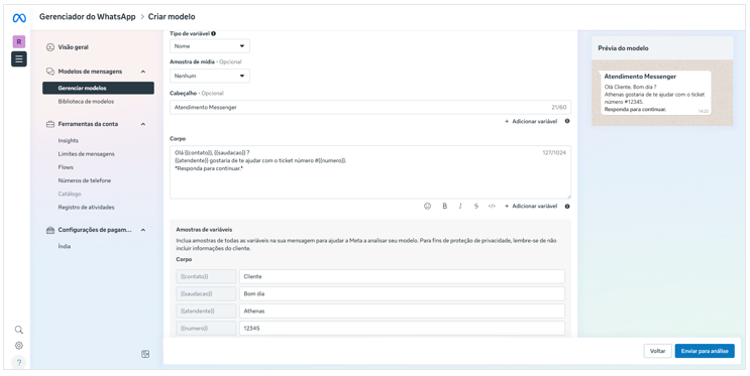 Após a aprovação, o nome do modelo e as variáveis configuradas deverão ser informados nas configurações do Messenger, conforme descrito no item 11.5 deste manual.