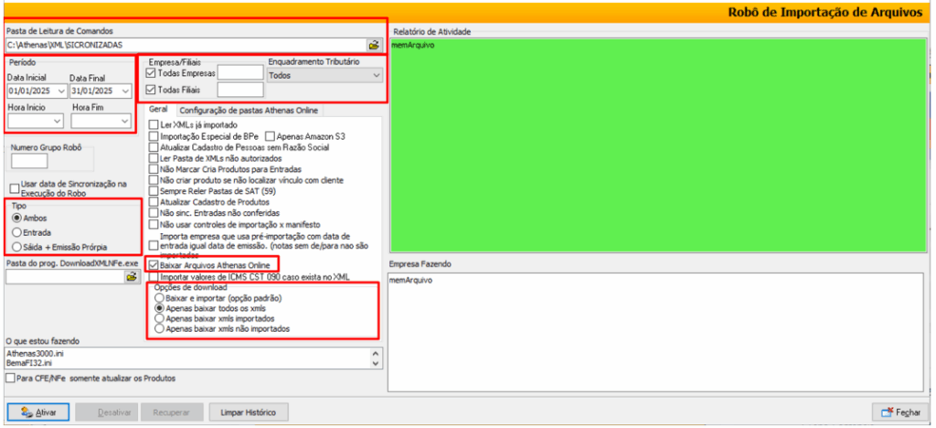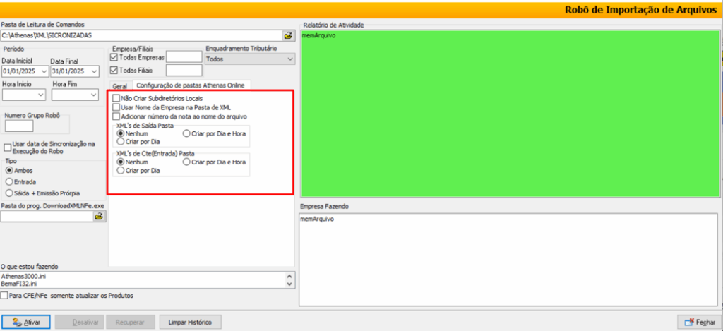 Pasta de Leitura de Comandos: Pasta onde o robô salvará os XML já sincronizados do Athenas Online.