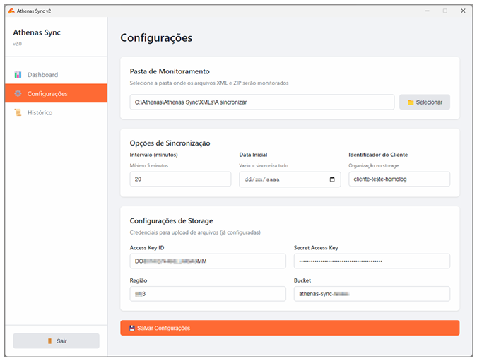 No campo Pasta de Monitoramento, selecione o diretório onde ficarão os arquivos XML e ZIP que deverão ser sincronizados.