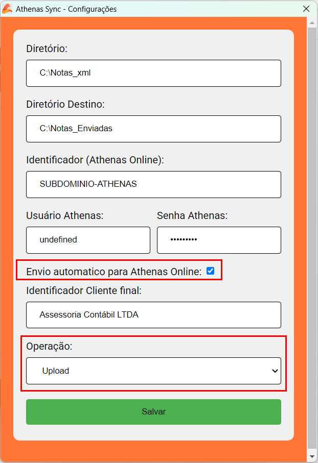 No campo Operação, selecione a opção “Upload”. Essa configuração define que os arquivos XML serão transmitidos automaticamente do diretório local para o Athenas Online.