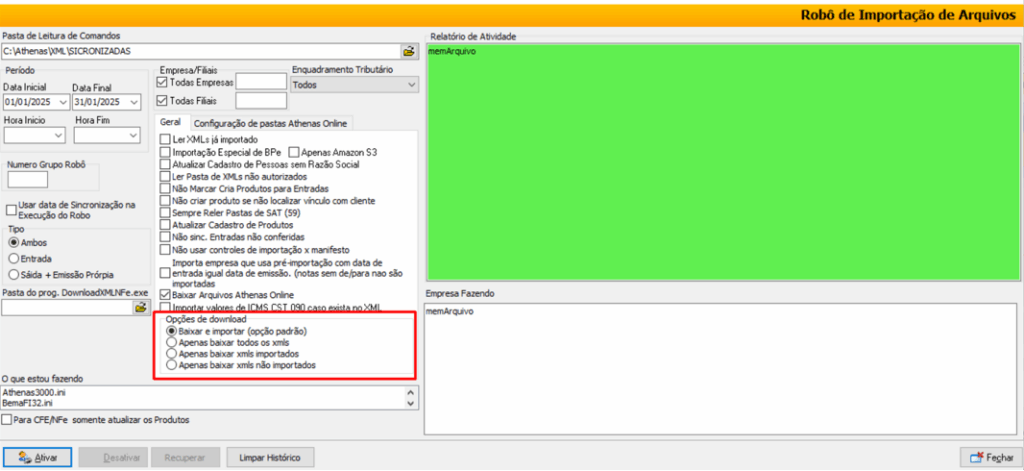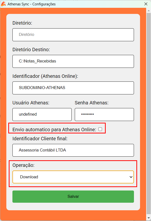 ⚠️ No modo Download, não é necessário marcar a opção “Envio automático para o Athenas Online”.
