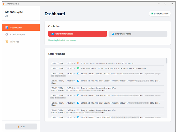 – Após a configuração, o Athenas Sync iniciará a sincronização automaticamente.