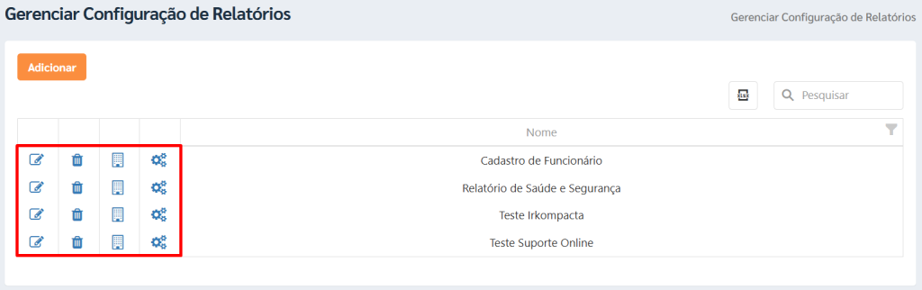 Na tela “Gerenciar Configuração de Relatórios”, cada linha possui ícones de ação. Veja abaixo o que cada um faz: