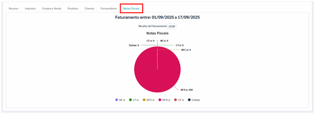 – Apresenta a distribuição das notas fiscais emitidas no período, classificadas por tipo de documento (NF-e, NFC-e, NFS-e, CF-e, CT-e e outras).