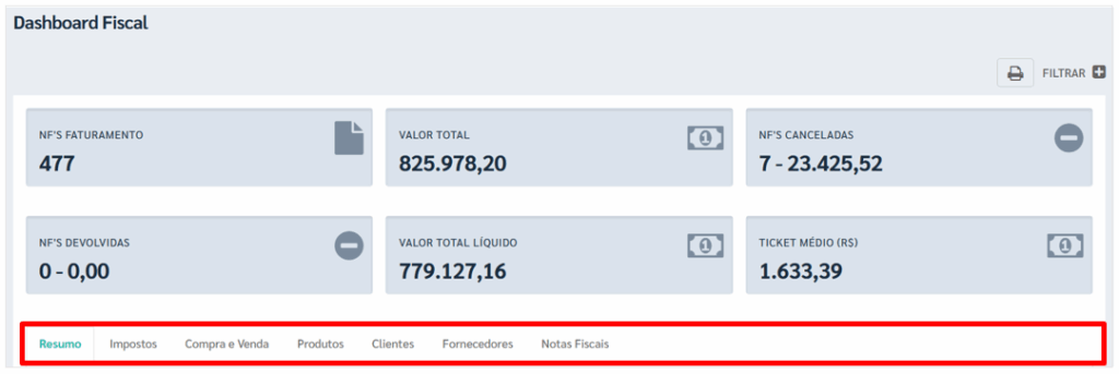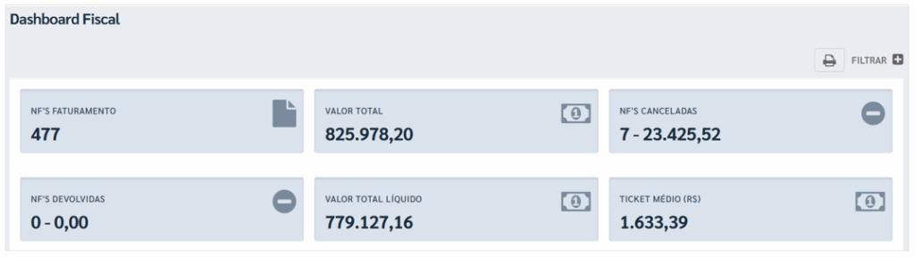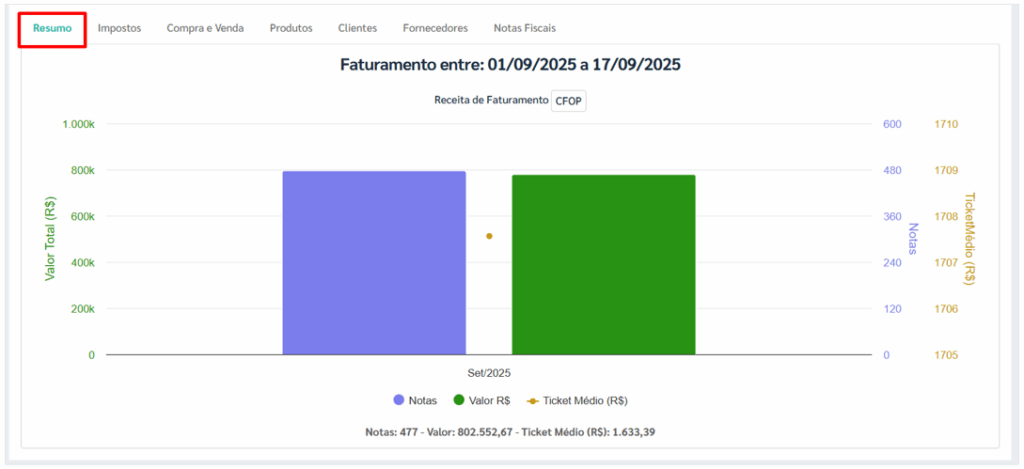 – Apresenta a quantidade de notas fiscais emitidas, o valor total faturado e o ticket médio no período selecionado.