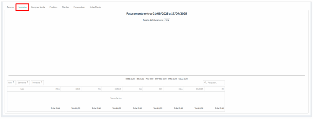 – Apresenta os principais tributos relacionados ao faturamento da empresa (ICMS, ISS, PIS, COFINS, IRPJ, CSLL, entre outros).
