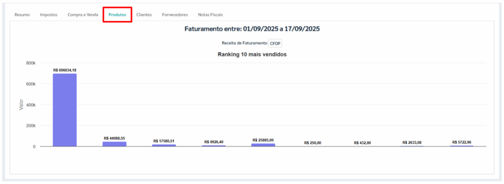 – Exibe o ranking dos 10 produtos ou serviços mais vendidos no período selecionado, com os respectivos valores faturados.