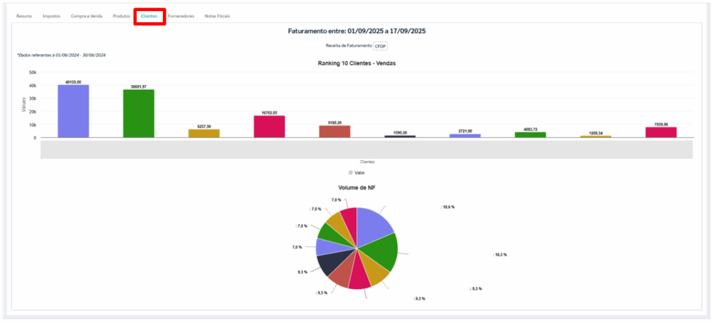 – Permite analisar a participação de cada cliente tanto em valores (gráfico de barras) quanto em volume de notas fiscais emitidas (gráfico de pizza).