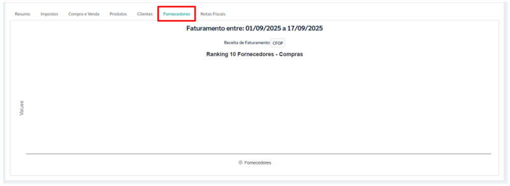 – Apresenta o ranking dos 10 principais fornecedores da empresa no período selecionado, destacando os valores de compras realizadas.