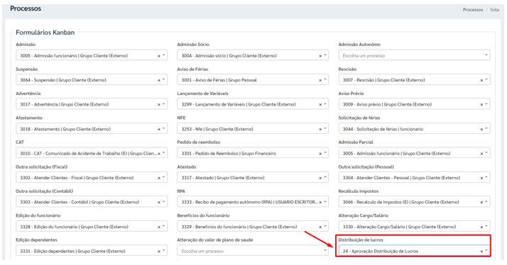 Recomenda-se a criação de um processo específico no Kanban para a aprovação de Distribuição de Lucros, contemplando etapas como, por exemplo: