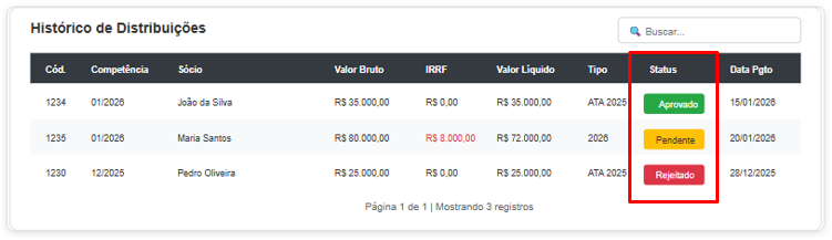 | Aprovado | 🟢 Verde | Distribuição aprovada e registrada no Controle de Tributos do sistema. |
