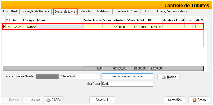 O sistema identifica se a distribuição possui valor tributável e se há IRRF a recolher, conforme as regras aplicáveis (ex.: limite mensal e origem do lucro).