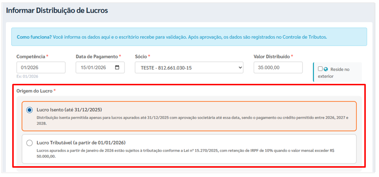 - Regra de tributação conforme a origem do lucro selecionada (Lucros aprovados até 2025 ou exercício 2026 em diante).