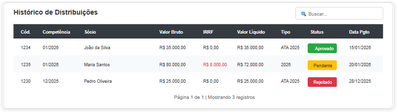 O sistema apresenta o histórico de todas as distribuições de lucros registradas, permitindo o acompanhamento completo das solicitações enviadas ao escritório.