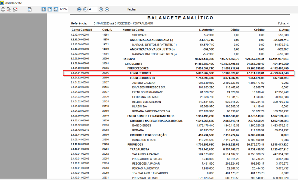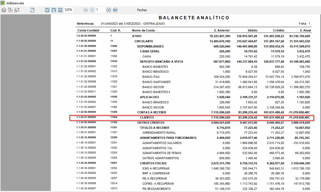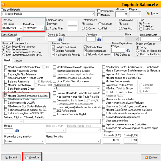 Clique em [Visualizar] para gerar o balancete com a exibição sintética das contas de Clientes e Fornecedores.
