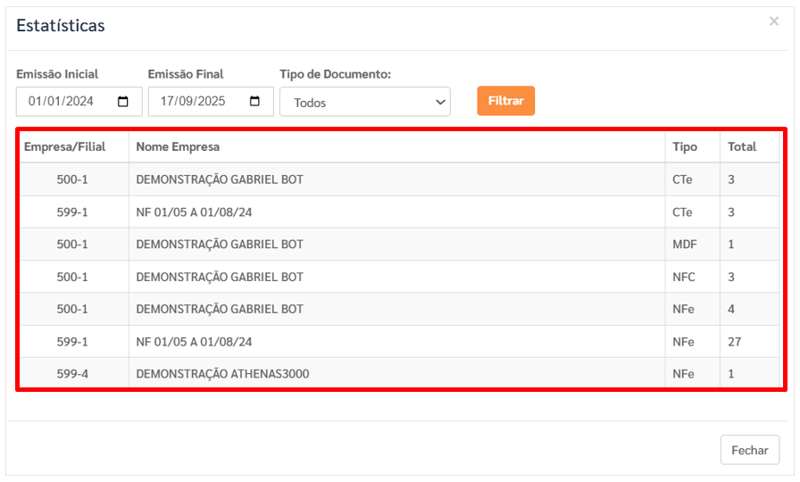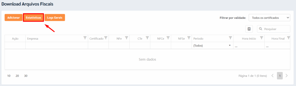 A opção Estatística permite acompanhar de forma consolidada a quantidade de arquivos baixados para cada empresa, dentro de um período específico.