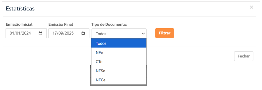 Tipo de Documento: selecione um tipo específico (NFe, CTe, NFCe, MDF-e, etc.) ou escolha Todos para visualizar em conjunto.