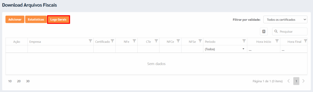 A opção Logs Gerais permite acompanhar de forma centralizada as últimas execuções do robô de download para todas as empresas. Clique no botão [Logs Gerais] para abrir a tela consolidada.