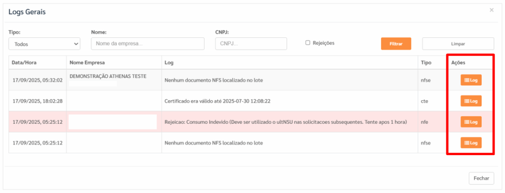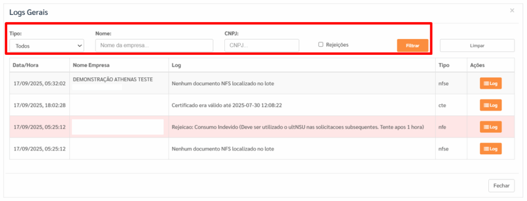 O sistema carrega automaticamente os logs de todas as empresas cadastradas. No entanto, caso deseje refinar a consulta, utilize os filtros disponíveis: