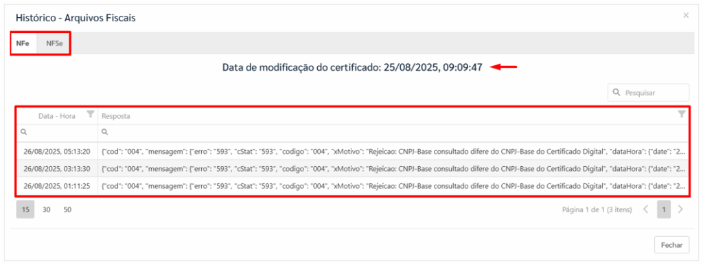 Exemplo: “Rejeição: CNPJ-Base consultado difere do CNPJ-Base do Certificado Digital”.